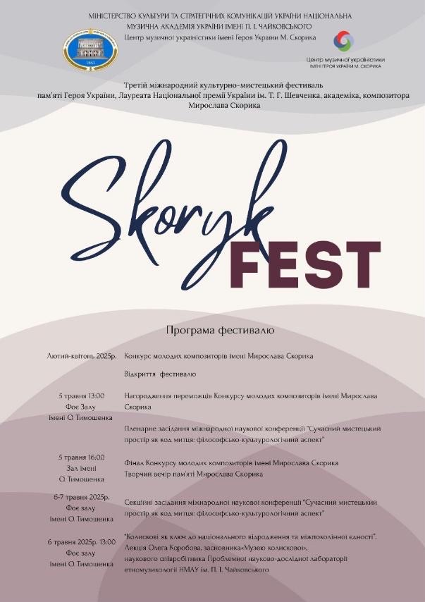 5-7 травня в Національній музичній академії України імені П. І. Чайковського відбудеться третій Skoryk FEST — фестиваль пам’яті видатного українського композитора Мирослава Скорика.