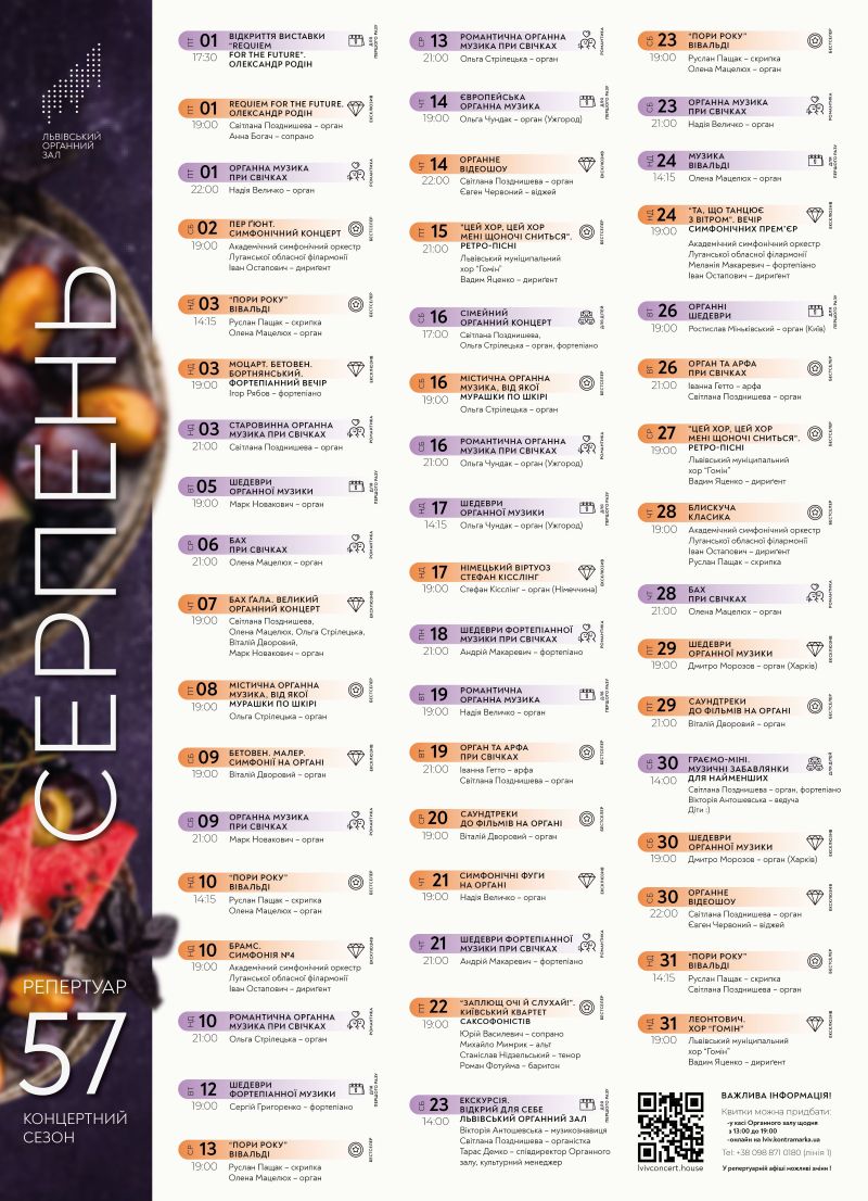 Звичайно, серпень буде наповнений органними концертами солістів Світлани Позднишевої, Ольги Стрілецької, Віталія Дворового, Марка Новаковича. Левову частку з них складуть концерти при свічках.