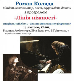 Разом з Романом Колядою на сцені виступатиме скрипалька Іванна Ворошилюк.