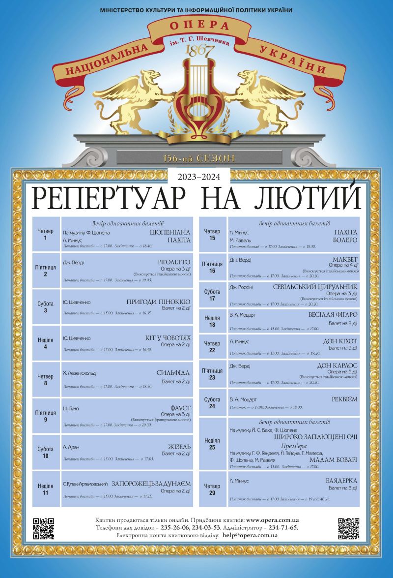 9 лютого (п’ятниця) о 17:00 - лірична філософська опера «Фауст» видатного французького композитора Шарля Гуно в оригінальній постановці італійського режисера Маріо Корраді. Головні партії виконають: Дмитро Кузьмін (Фауст), Сергій Ковнір (Мефістофель) та Анастасія Поважна (Маргарита). Окрасою вистави є знаменита балетна сцена «Вальпургієва ніч» у виконанні артистів балету театру;