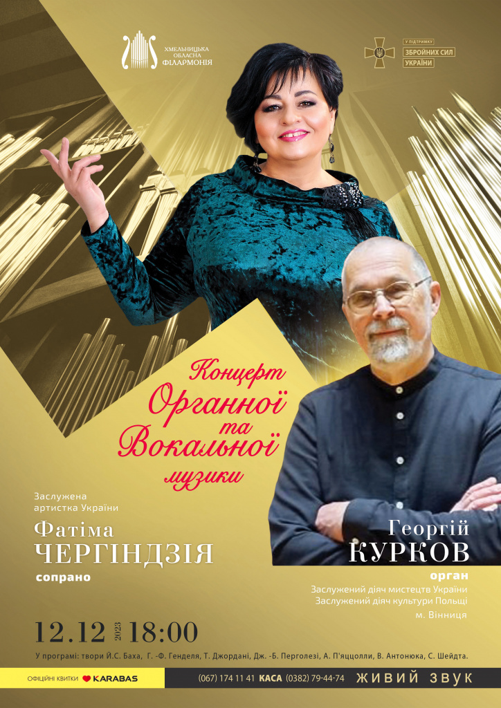 Цього вечора свою концертну програму вашій увазі представить надзвичайно цікавий творчий тандем – піаніст, органіст, диригент, заслужений діяч мистецтв України та заслужений діяч культури Республіки Польща Георгій Курков та талановита вокалістка, володарка чудового сопрано, заслужена артистка України Фатіма Чергіндзія.