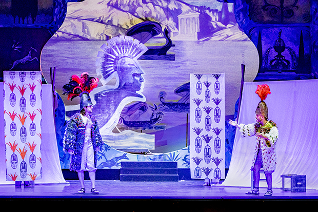 Відсутність внутрішньої логіки лібрето – не єдина проблема цієї постановки. В «Іфіґенії в Авліді» бездоганні вокалісти не мали багато шансів показати свій артистизм і розгорнути ефектну взаємодію на сцені. Театральний потенціал опери Кальдара ʽзастрягʼ на рівні музейного театру маріонеток. Режисура Санті Арналь і Анни Фернандес – іспанського дуету під назвою Per Poc та художниці Олександри Семенової – наслідували наївний стиль барокових декорацій, малюнків, що імітують візуальну естетику дитячих ілюстрованих книжок за мотивами античної міфології і картин природи. Пласкі моделі чорно-білого фонтана, кольорового павича, грецьких кораблів, картонної фігури Діани час від часу пересували по сцені статисти. Костюми героїв пародіювали радше тевтонських лицарів, аніж троянських вояків, а однакові смугасті сукні жінок, неначе з в’язниці, напевно, натякали на патріархальний диктат чоловіків. Візуально сценографія стилізувала уявлення про бароковий театр часів Кальдара, натомість цей декоративний фон не запропонував нічого нового до інтерпретації змісту опери, навіть спростив сприйняття драматичної дії.