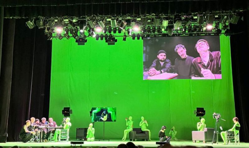 На яскраво зеленому фоні( хрома кей - на цей фон при зйомці можна накласти все що завгодно, будь-який ефект)розігрується драма автора, якого не чують, думки якого тонуть в кон'юнктурі традиційних поглядів на п'єсу,і яки висвітлені у виставі гострою сатирою. В автора не вірять всі: починаючи від батька, закінчуючи творцями п'єси, які ,не чуючи думки митця, розповідають як краще, цікавіше, розважальніше.