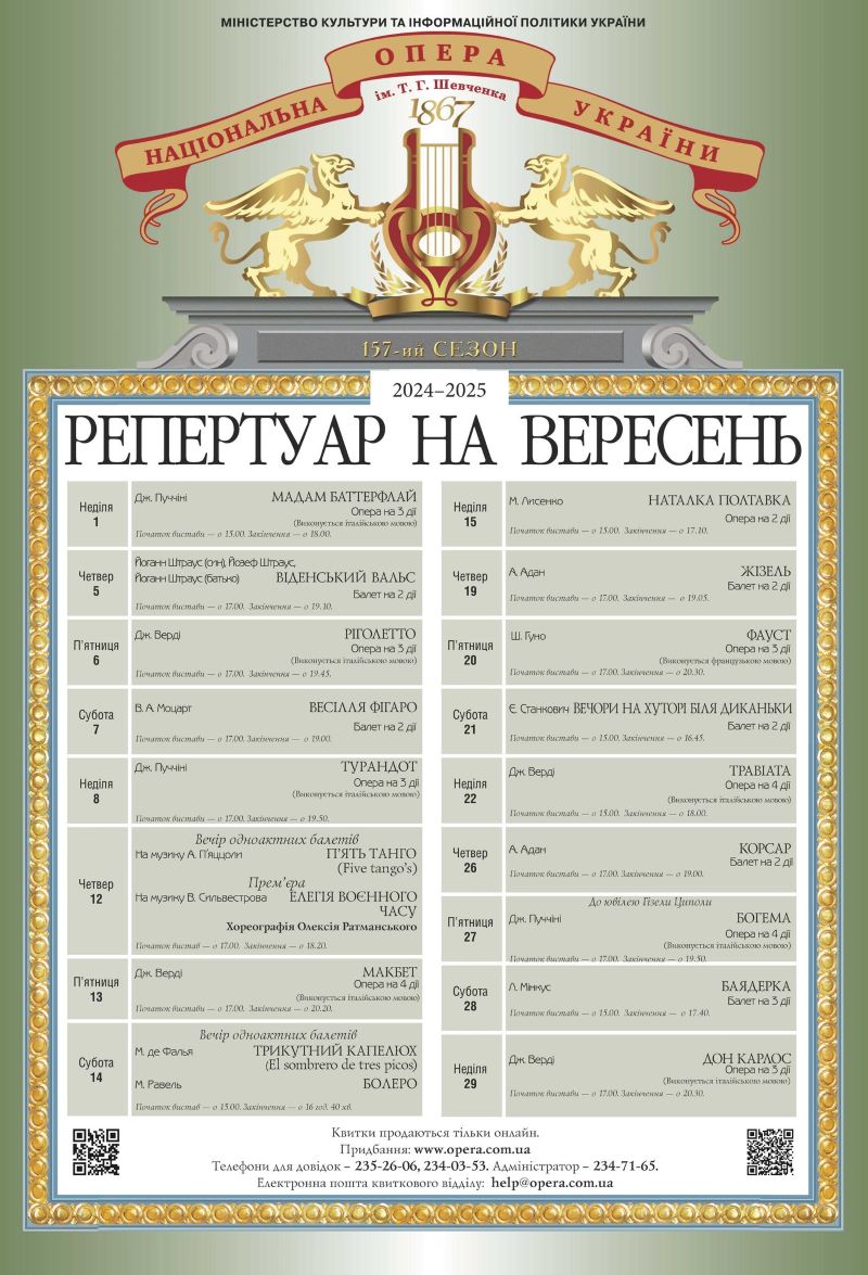 І хоча вистави все ще залишають виключно «денними» (інформація про початок вистави указана в афіші та на сайті театру), а кількість глядачів в залі все ще обмежена (лише 459 осіб), Національна опера України своїм вересневим репертуаром гарантує радість від зустрічі з улюбленими виставами та артистами, що допоможе нам всім (і глядачам, і виконавцям) уникнути постстресового емоційного «вигорання»!