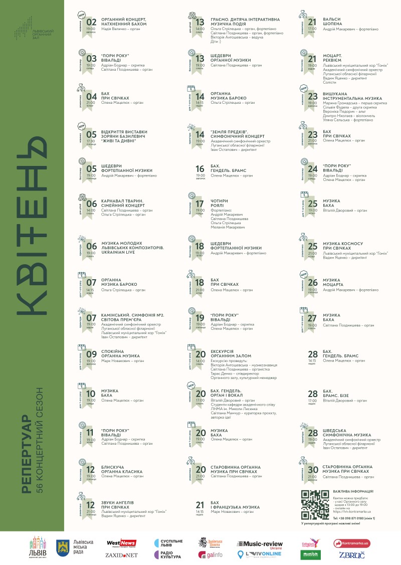 Квітень буде наповнений великою кількістю органних концертів – “Бах при свічках”, “Блискуча органна класика”, “Бах. Гендель. Брамс” (Олена Мацелюх), “Органна музика бароко” (Ольга Стрілецька), “Бах і французька музика”, “Спокійна органна музика” (Марк Новакович), “Шедеври органної музики”, “Старовинна органна музика”, “Музика Баха” (Світлана Позднишева), “Бах, Брам. Бізе” (Віталій Дворовий).