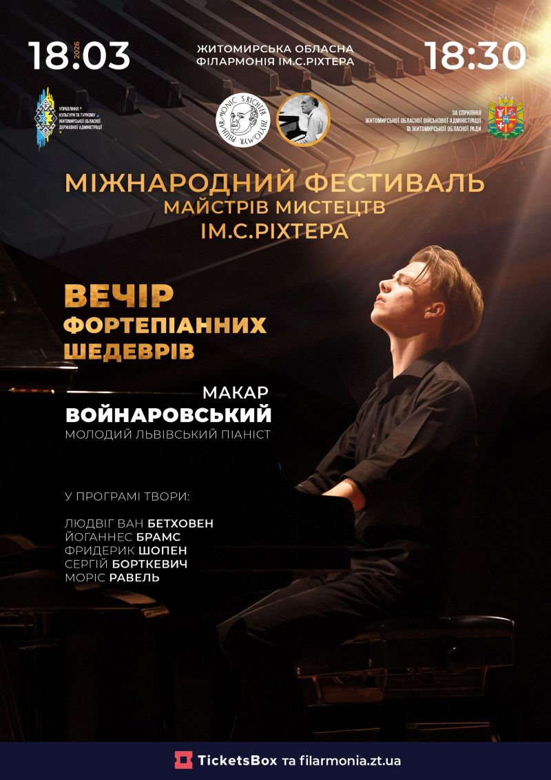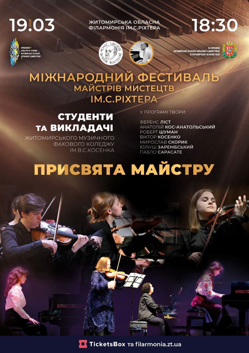 18 березня о 18:30 у залі Житомирської обласної філармонії ім. С. Ріхтера прозвучить музика, з якої розпочнеться Міжнародний фестиваль майстрів мистецтв імені Святослава Ріхтера — подія, яка щороку об’єднує виконавців і слухачів навколо справжніх цінностей академічного мистецтва.