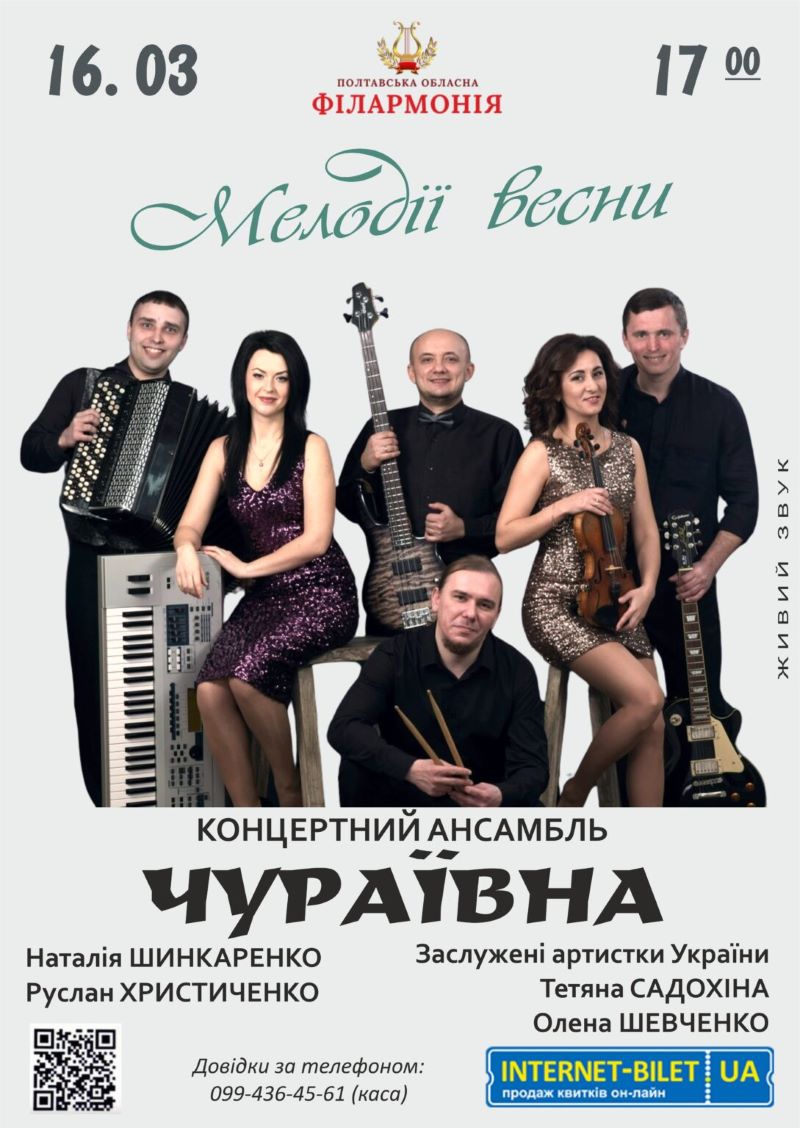 16 березня 2024 року о 17:00 ансамбль "Чураївна" чекає усіх на гостини - святковий концерт з приводу дня народження колективу!Мелодії весни, що звучатимуть від серця, подарують вам музиканти ансамблю: Альона Кіба (скрипка), Алла Чепець (клавішні), Роман Шегера (баян), Костянтин Дусенко (гітара), Роман Трирог (ударні), Сергій Бригида (бас-гітара, художній керівник).