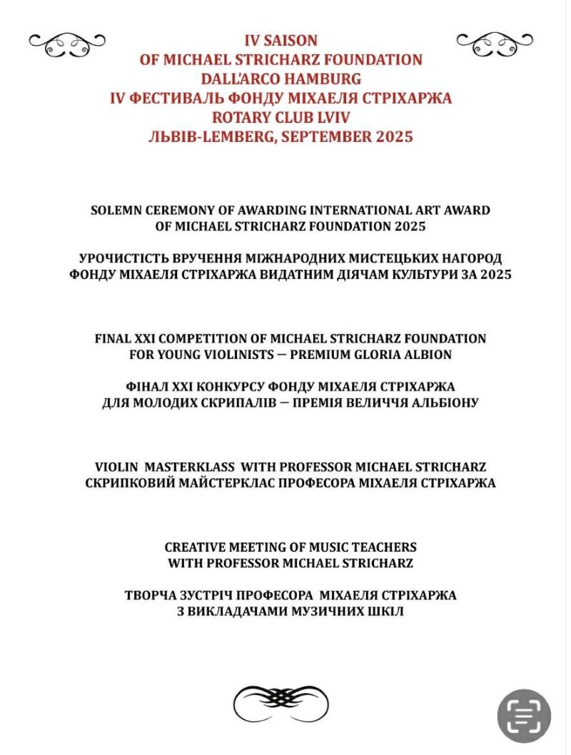 Цьогорічний приїзд маестро до Львова також включав кілька складових. Відкриттям урочистостей IV Фестивалю Фонду Міхаеля Стріхаржа («IV. Saison of Michael Stricharz Foundation Dall’Arco Hamburg in Ukraine, Lviv 2025») 21 вересня в музеї Олекси Новаківського стало вручення німецьких міжнародних мистецьких нагород за 2025 рік від цього фонду.