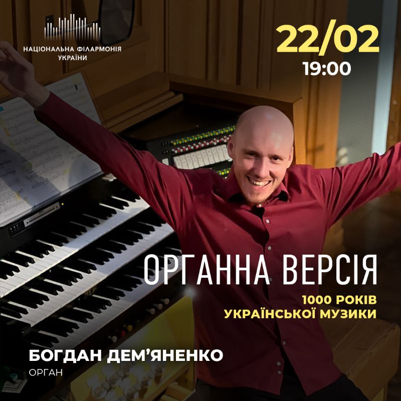 22 лютого відбудеться перша концертна програма проєкту «1000 років української музики: органна версія», започаткованого українським музикознавцем, композитором та органістом Богданом Дем’яненком. Слухачі матимуть змогу пройти чималий історичний шлях і поринути в українську музику Середньовіччя, Бароко, Класицизму та сучасності. Орган ми зараз мимоволі асоціюємо лише із західноєвропейською музикою, але на стіні Софійського собору в Києві серед придворних музикантів Ярослава Мудрого зображений і органіст. Тож українська, зокрема і хорова музика – на органі саме зараз дозволяє особливо емоційно відчути глибинні зв’язки із західноєвропейською музичною традицією. Деякі твори програми звучатимуть прем’єрно! Інші – після тривалого забуття, нині розшифровані з рукописів і адаптовані для виконання на органі, – прозвучать вперше за останні 300 років!