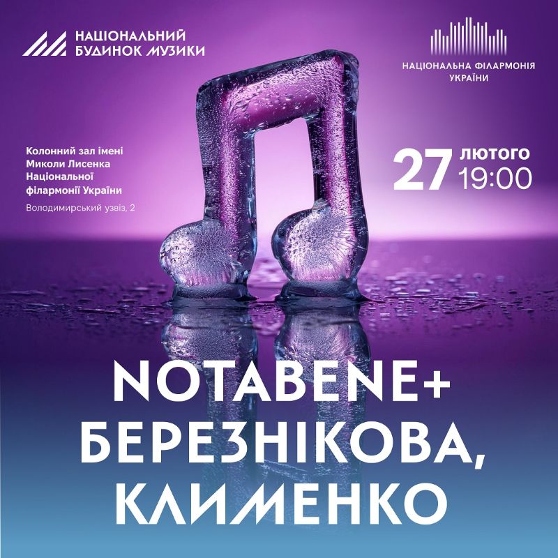 27 лютого NotaBene +. Концерт перший. Цей спільний проєкт NotaBene Chamber Group та Національного будинку музики, – відкриває нову генерацію виконавиць та виконавців, композиторок та композиторів і розпочнеться він символічно у день першого виступу NotaBene Chamber Group, що відбувся рівно 9 років тому. Це буде 4 програми, де молоді виконав(и)ці гратимуть разом із музикантами NotaBene, а також програма нової музики молодих композиторів/-ок. У першій програмі циклу до квартетів Гайдна і Веберна доєднається скрипалька Катерина Березнікова, а також прозвучить Фортепіанний квінтет Шумана разом із піаністкою Марією Клименко.