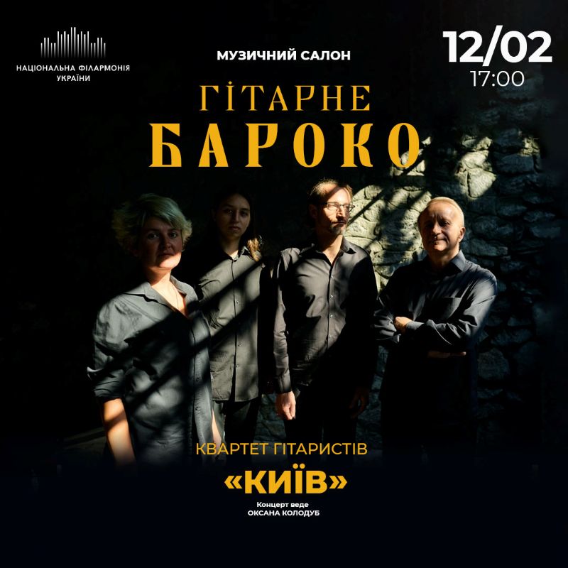 12 лютого Квартет гітаристів «Київ» запрошує на концерт «Гітарне бароко», в якому звучатимуть, як улюблені відомі твори барокових майстрів – Йоганна Пахельбеля, Антоніо Вівальді, Йоганна Себастьяна Баха, Доменіко Скарлатті, так і маловиконувані інструментальні шедеври Жана-Філіппа Рамо, Генрі Персела, лютніста Робера де Візе та шведського скрипаля і гобоїста Югана Гельміка Румана.
