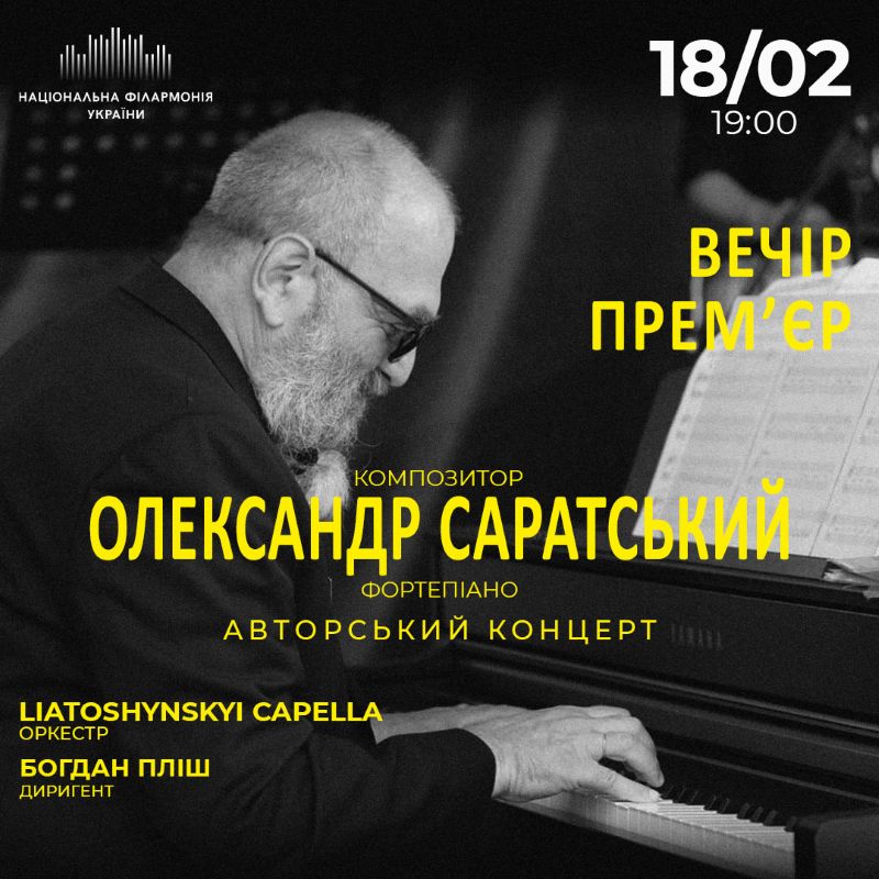 18 лютого на свій авторський Вечір прем’єр | Premiere Evening запрошує відомий український композитор і джазовий піаніст Олександр Саратський. У програмі прозвучать дві прем’єри: Симфонія № 5 і Концерт для фортепіано з оркестром № 10 фа мінор у виконані автора та Liatoshynskyi Capella Orchestra Національного будинку музики під керівництвом Богдана Пліша. У своїй творчості Олександр Саратський органічно поєднує традиції джазу, академічної музики та українського фольклору. Цим концертом композитор розпочне свій черговий тур містами України, який має на меті підтримати та надихнути музикою широку аудиторію у складні часи війни.