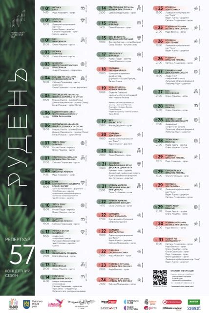 У виконанні органіста Марка Новаковича 1 грудня звучатиме “Музика Баха”. 8 та 11 грудня почуєте улюблену класику, яка стала бестселером на концерті - “Шедеври органної музики”, а 12 грудня Віталій Дворовий виконає програму з творів “Бах. Пахельбель. Гендель”. “Бах. Брамс Бізе” пропонуємо відвідати 19 грудня. “Європейська органна музика” трьох століть, різних стилів, настроїв, але однаково високого ґатунку звучатиме у виконанні Ольги Стрілецької 29 грудня!