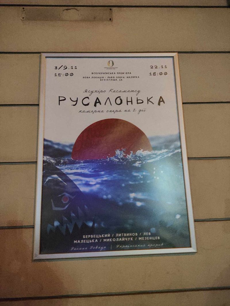 Першою виставою в цьому просторі стала камерна опера на 2 дії «Русалонька» сучасного японського композитора Ясухіро Касаматсу на лібрето Шоічіро Івакірі за мотивами казки Ганса Крістіана Андерсена. Отже українська постановка японського автора за твором датського письменника – такий багатошаровий синтез зумовив пошук відповідних форм і засобів.