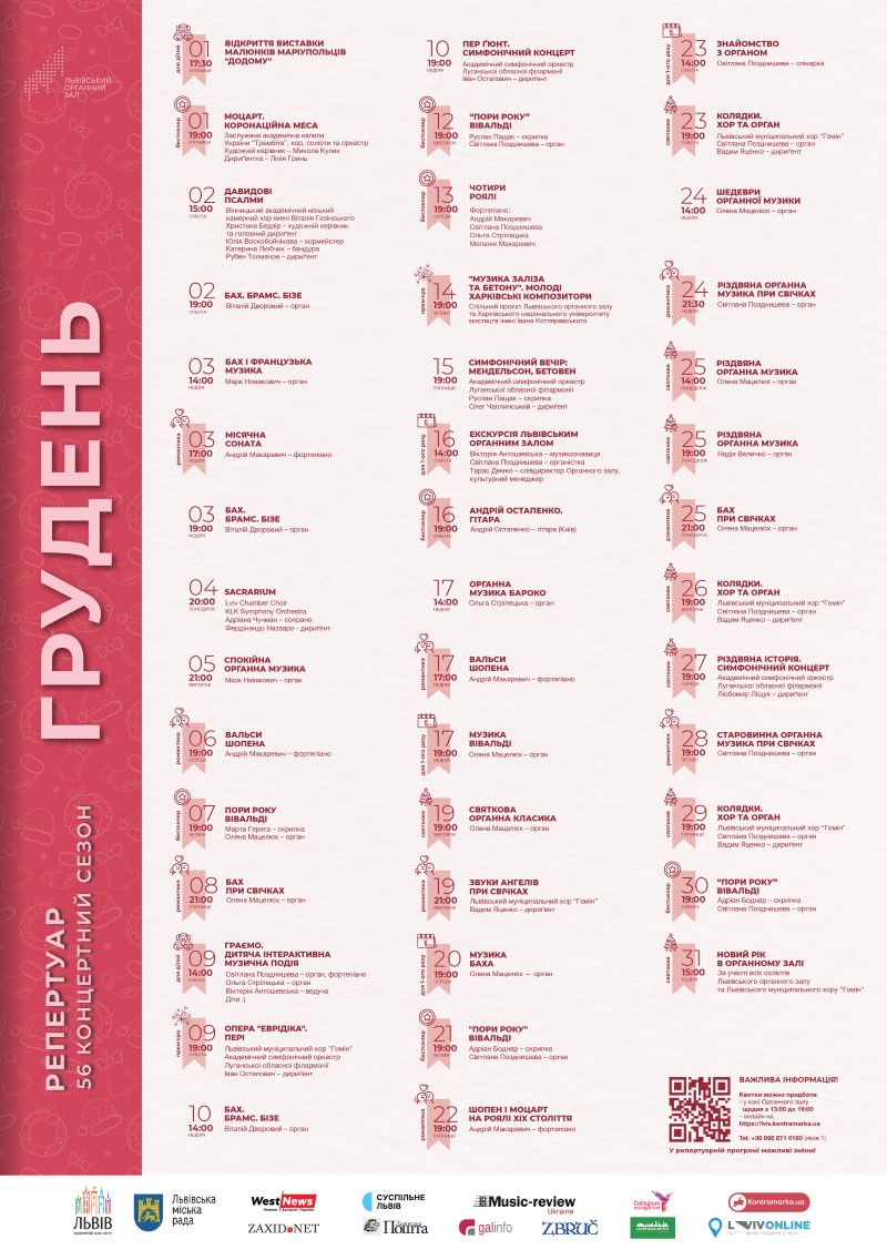 Понад чотири десятки подій у Львівському органному залі у грудні