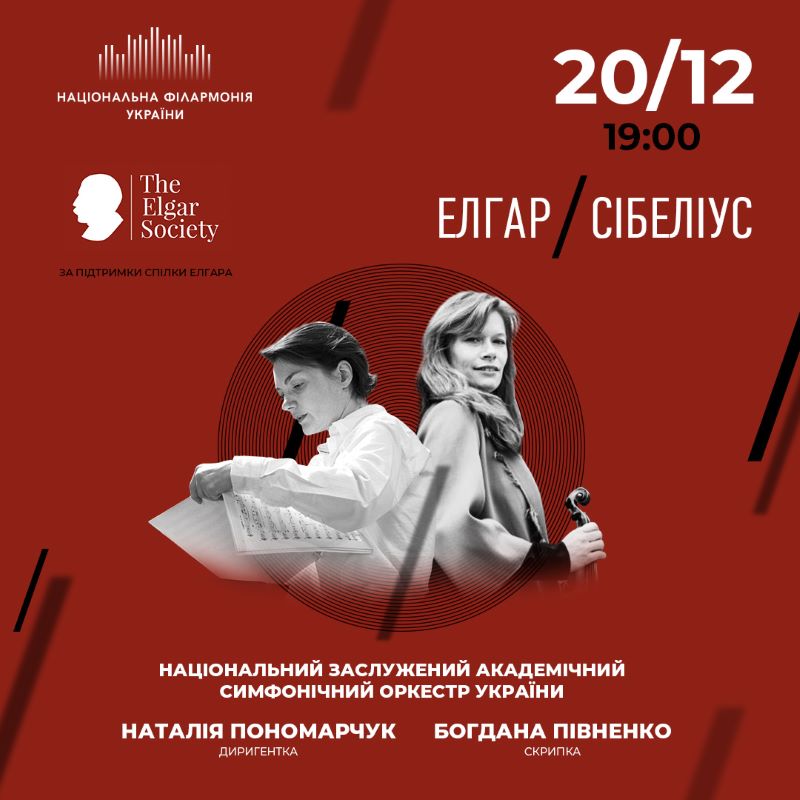 У виконанні Національного симфонічного оркестру України під батутою Наталії Пономарчук звучатимуть Концерт для скрипки з оркестром ре мінор Яна Сібеліусв, солістка Богдана Півненко та Симфонія № 1 ля-бемоль мажор англійського композитора Едварда Елгара – перше виконання у Колонному залі імені Миколи Лисенка НФУ.