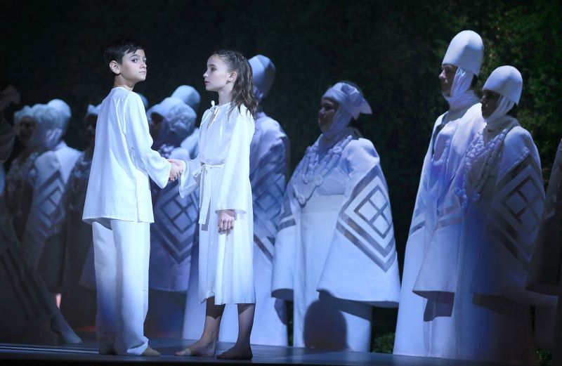 Одяг головних героїв за кольором, пластикою, стилізацією акцентує їх сутність у розгортанні повісті, їх душі, стосунки і цінності. І тут вже немає меж свободі експерименту: від прозорих кольорових полотен, пластичних і лаконічних повсякденних селянських одеж в натуральних барвах, вишуканих витинанкових стилізацій святкових плахт, чересів, вишиванок, до гіперболізованих маланкових масок, елементів європейських карнавальних костюмів і разючих за барвами та символікою образів Палагни і Чугайстра.