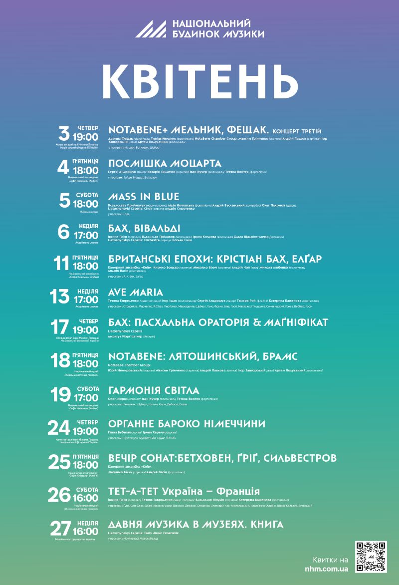 Квітневий репертуар Національного будинку музики пропонує слухачам відкрити різноманітний спектр музики Йоганна Себастьяна Баха та його “лондонського” сина Йоганна Крістіана, уявити прогулянку музичними вулицями Відня та посміхнутися разом із Моцартом. Крім того, прозвучать найчуттєвіші твори української музики, органне бароко Німеччини та твори наших сучасників.