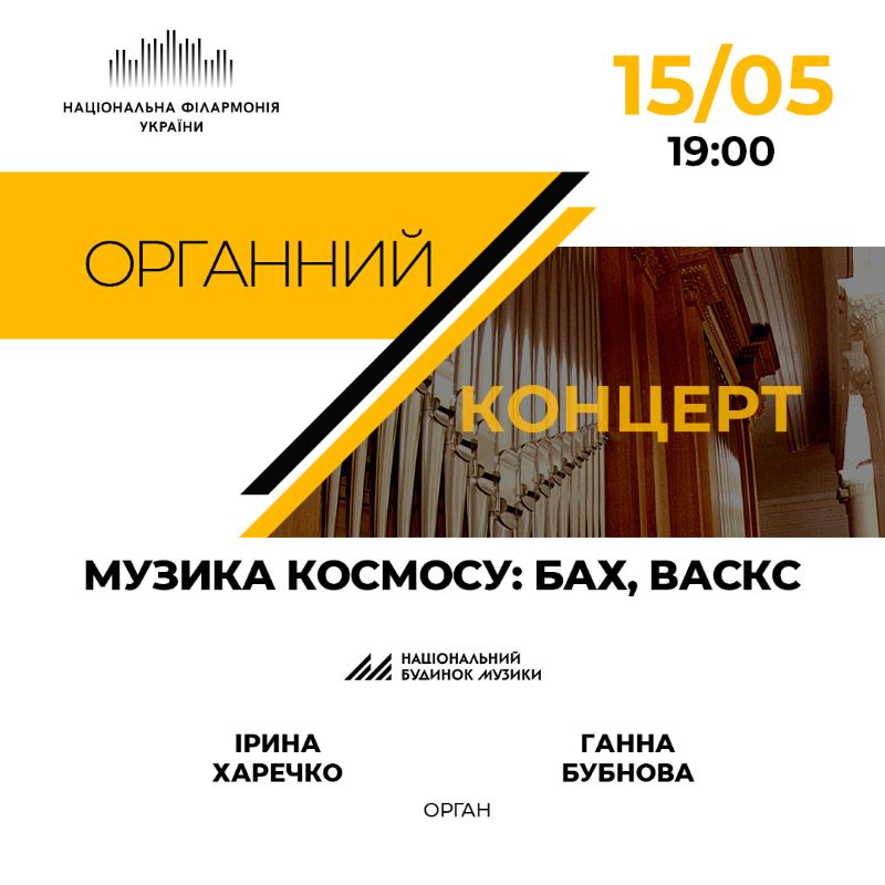 15 травня Національний будинок музики запрошує до філармонії на органний концерт Музика космосу: Бах, Васкс за участю органістки Ірини Харечко. Музика Петеріса Васкса, сучасного латвійського композитора може наштовхнути на думки про далекий та невідомий Космос, хоча й незагрозливий. А досконалі поліфонічні конструкції, наявні у композиціях Баха – приклад математичної досконалості та утвердження античних ідей присутності макрокосму (великого) у мікрокосмі (малому) та дозволяють нам доторкнутися до Всесвіту, не покидаючи меж атмосфери Землі.