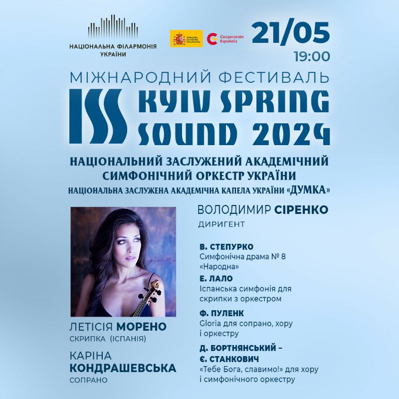 Серед інших гостей – іспанська скрипалька Летісія Морено, яка з 12 років виступає з провідними оркестрами різних країн. 21 травня вона зіграє сольну партію в Іспанській симфонії для скрипки з оркестром француза Едуара Лало. Цей твір прозвучить разом із Симфонічною драмою №8 «Народна» нашого сучасника Віктора Степурка.
