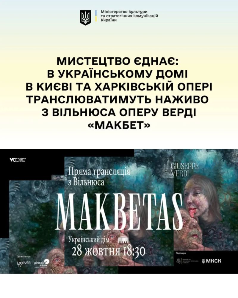 28 жовтня в Національному центрі «Український дім» в Києві відбудеться пряма трансляція опери Джузеппе Верді «Макбет» у постановці Вільнюської міської опери та Державного симфонічного оркестру Литви