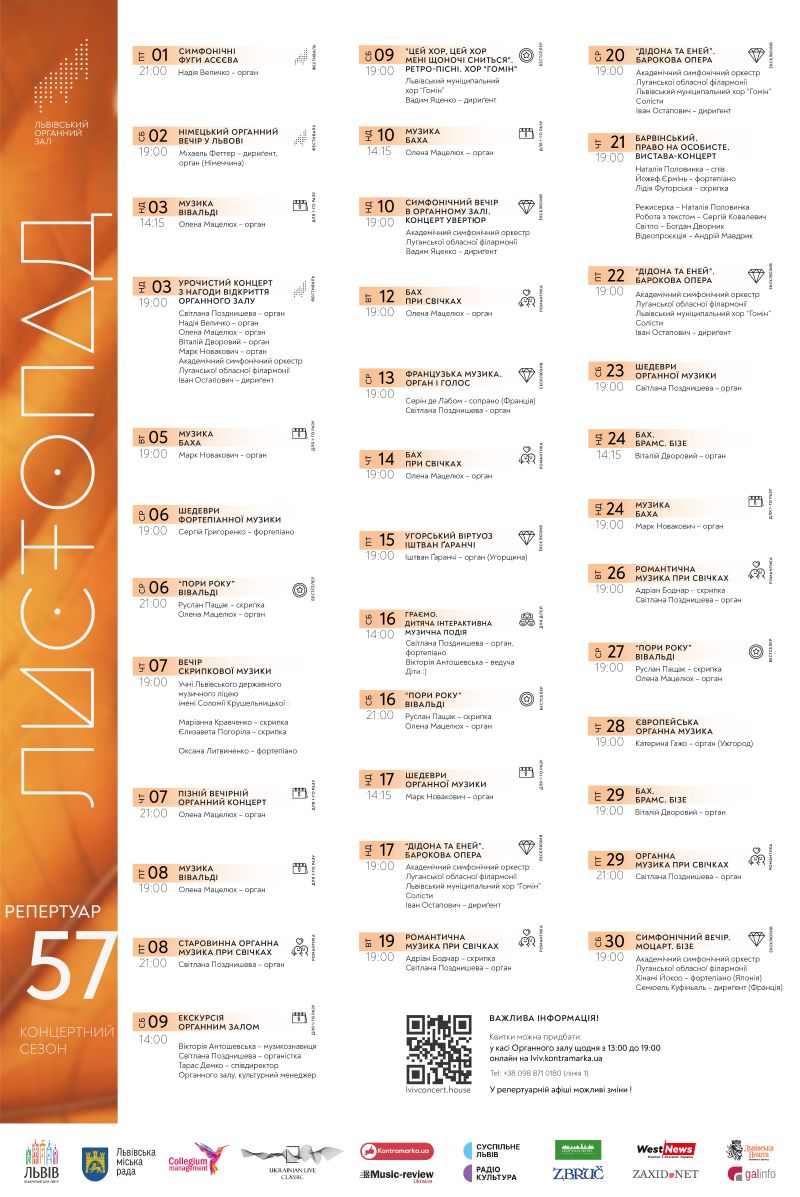 У листопаді у Львівському органному залі відбудеться 37 подій, серед яких завершальні концерти XIV Львівського міжнародного органного фестивалю, презентації видання “Хроніка Львівського органного залу”, премʼєра барокової опери Гені Перселла “Дідона та Еней” українською та виступи музикантів з-за кордону, таких як піаністка Хінамі Йокоо (Японія), дириґент Семюель Куфіньяль (Франція), сопрано Серін де Лабом (Франція), органіст Іштван Ґаранчі (Угорщина).