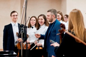 Стоит отметить еще одно организационное решение: пространство сцены позволило максимально сократить время на подготовку следующего номера. Так, за спиной у еще выступающего хорового коллектива разместился симфонический оркестр (под руководством студента второго курса НМАУ им. П. И. Чайковского –Артема Кузьменко). Он и представил всеобщему вниманию третью часть Симфонии №2 Льва Ревуцкого. Обволакивающее оркестровое звучание создало целую «историю», где музыкальные события сменяли друг друга, подобно изображениям калейдоскопа. Увенчивали произведение бравурные фанфары, символично утверждая победоносные мотивы украинской народной «А ми просо сіяли».