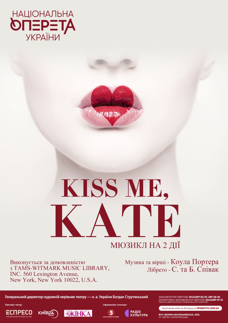 Нагадаємо, що мюзикл відомого американського композитора Коула Портера «Цілуй мене, Кет!» витримав понад тисячу постановок на Бродвеї і понад 400 – у Лондоні! Це – надзвичайно цікава і захоплююча історія про акторів, що працюють в театрі над постановкою «Приборкання норовливої» У. Шекспіра.