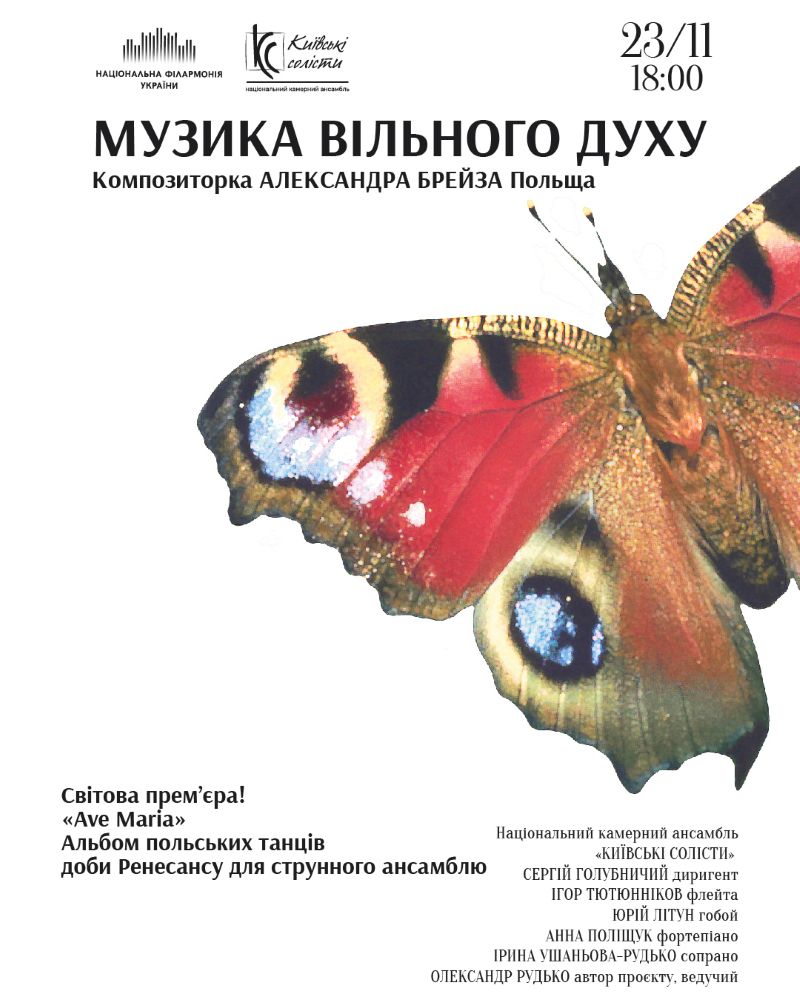 В неділю, 23 листопада, в Колонній залі Національної філармонії України відбудеться проєкт, присвячений творчості сучасної польської композиторки Александри Брейзи: Звукова гімнастика для мами, тата і малюка 3+ (12:00) та «Музика вільного Духу» (18:00).