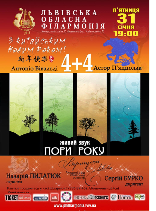 В концертному залі Львівської обласної філармонії звучатимуть «Пори року» знаменитого італійця Антоніо Вівальді та всесвітньо популярного короля танго – аргентинця Астора П’яццолли у виконанні неординарного віртуоза-скрипаля – Назарія Пилатюка під орудою народного артиста України Сергія Бурка.