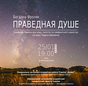 25 січня 2016 року на сцені Колонному залі Національної Філармонії України відбудеться виконання Симфонії-Реквієму "Праведная душе" на вірші Тараса Шевченка відомої львівської композиторки Богдани Фроляк, лауреата премій ім. Л. Ревуцького, Б. Лятошинського, М. Лисенка та С. Людкевича присвячений Дню Соборності України.