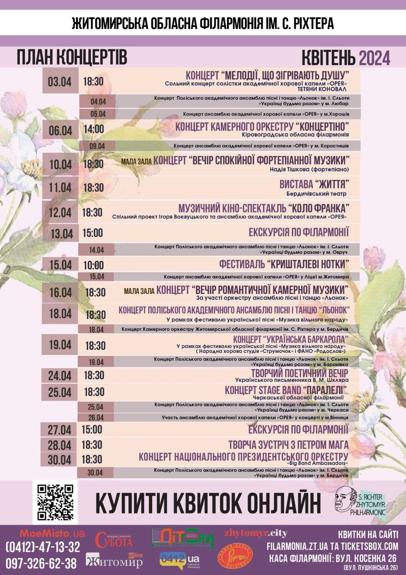 Житомирська обласна філармонія імені Святослава Ріхтера запрошує поціновувачів музики на концертні дійства, які відбудуться у квітні.