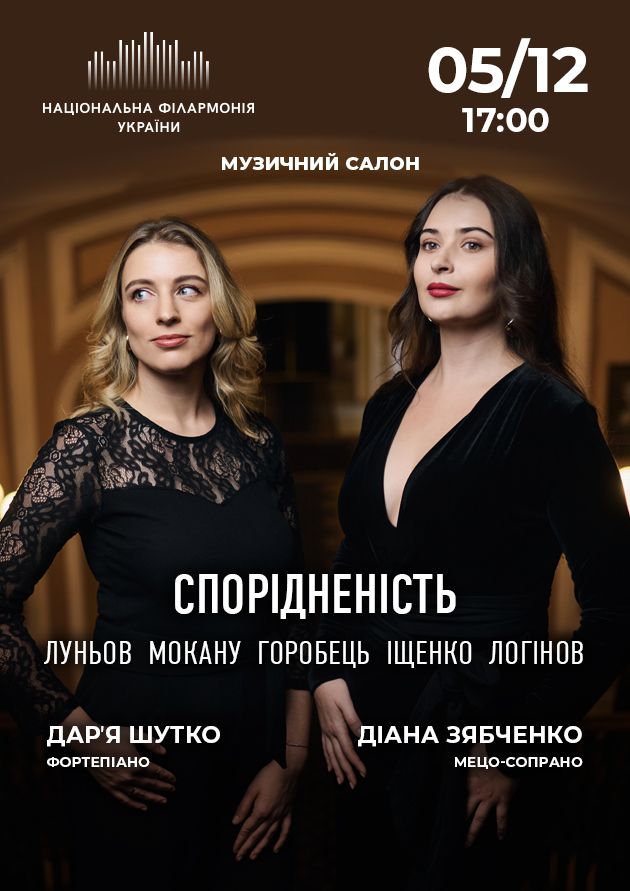 5 грудня концерт «Спорідненість» Діани Зябченко, мецо-сопрано і Дар’ї Шутко, фортепіано. Взаємодія, дослідження, цілісність. Зв’язок музики та слова, поезії та звуку. Протистояння за першість чи гармонійна взаємодія?