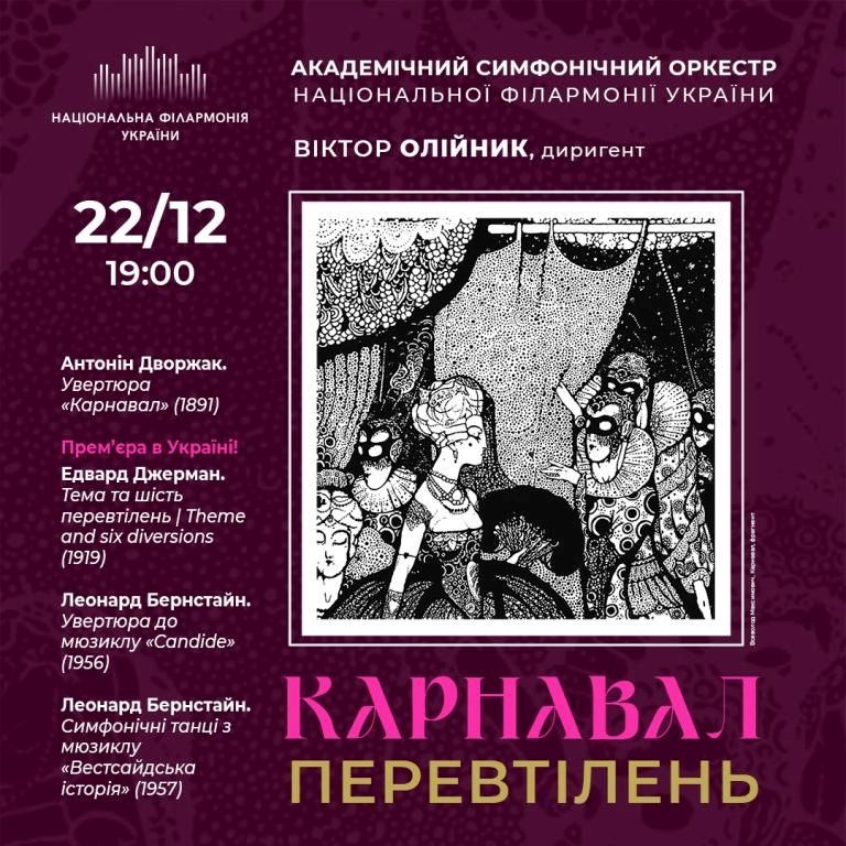 22 грудня у філармонії «Карнавал перевтілень» з Симфонічний оркестром Національної філармонії під орудою маестро Віктора Олійника. Передріздвяний період – той казковий час, коли ми очікуємо дива та чар. Втім магічні перетворення трапляються в історіях, а не в реальному житті, а ось музичні – бувають!
