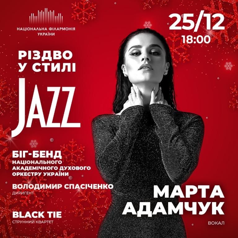 25 грудня вперше на цій філармонічній сцені неймовірне зіркове поєднання: джазового Біг-Бенду Духового оркестру, струнного квартету Black Tie та неперевершеної солістки Марти Адамчук під орудою Володимира Спасіченка, фіналіста шоу «Х Фактор». У програмі всесвітньовідомі джазові композиції із американського різдвяного репертуару: Jingle Bells, Christmas Time is Here, White Christmas, Let it Snow тощо. Популярна колядка Silent Night прозвучить у надзвичайно красивій джазовій обробці.