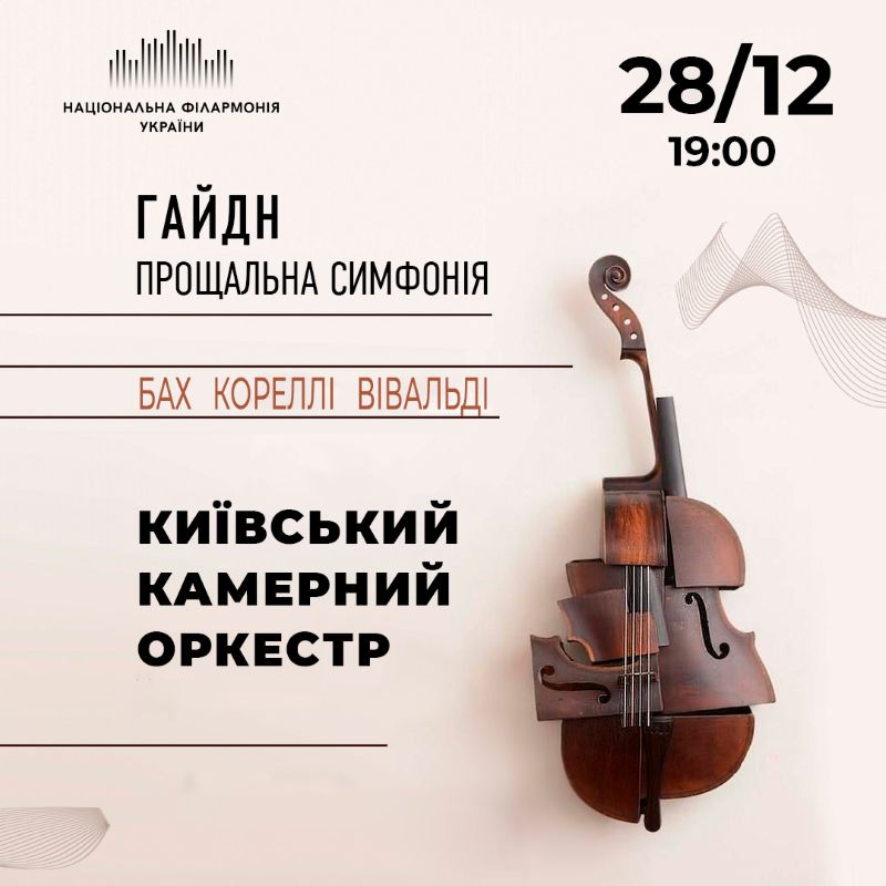 28 грудня Йозеф Гайдн | Симфонія «Прощальна» у виконанні Київського камерного оркестру. Традиція проводжати рік «Прощальною» симфонією Йозефа Гайдна у Національній філармонії – налічує років двадцять. Ідея належить Роману Кофману. Знаний диригент довгі роки очолював Київський камерний оркестр. Нагадаємо, у фіналі симфонії артисти почергово припиняють гру, гасять свої свічки, закріплені на пюпітрах, й один за одним залишають сцену.