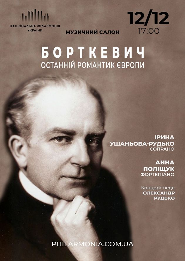 12 грудня у програмі «Борткевич. Останній романтик Європи» сопрано Ірина Ушаньова-Рудько та піаністка Анна Поліщук представлять ексклюзивну програму з камерних творів українського композитора і піаніста Сергія Борткевича. Життя композитора Борткевича було буремним, за його подіями можна зняти не один гостросюжетний фільм. Харків, Відень, Берлін, Константинополь... це не весь список міст, де довелося жити композитору. Не в останню чергу, через це, зараз важко зібрати і систематизувати його творчу спадщину. Широкому загалу Сергій Борткевич відомий у першу чергу, як автор фортепіанної музики. Проте, в його доробку є й симфонії, камерні інструментальні й вокальні твори. Саме вокальна музика є найменш відомою частиною його творчості. В концерті будуть виконані два вокальні цикли на слова Поля Верлена та Грети Кербер-Горвіц, написані французькою і німецькою мовами. Звучатиме фортепіанна камерна музика композитора. Таким чином, творчість Сергія Борткевича стає ще одним містком, який поєднує Україну і Європу.