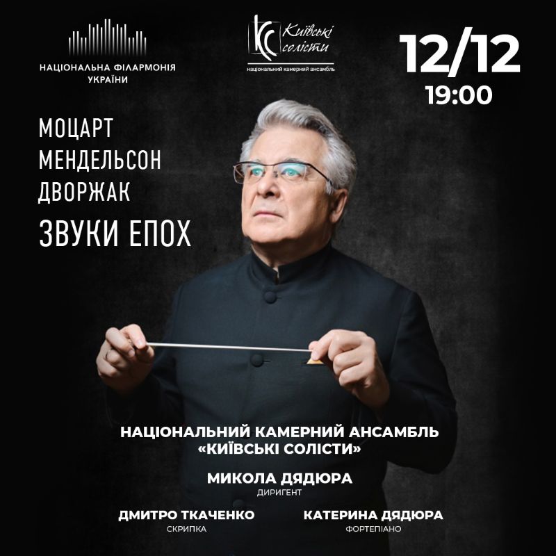 12 грудня – Звуки епох: Моцарт | Мендельсон | Дворжак почуємо, завдяки Національному камерному ансамблю «Київські солісти» піл орудою маестро Миколи Дядюри. Солісти: Дмитро Ткаченко скрипка та Катерина Дядюра фортепіано. Концерт розпочнеться з ранньої симфонії Моцарта, написаної композитором у віці 9-ти років. Цей твір вражає своєю енергією та витонченістю. Подвійний концерт ре мінор для скрипки, фортепіано та струнних німецького композитора-романтика Фелікса Мендельсона, – відзначається складною взаємодією між солістами та оркестром, свіжістю ідей, втілених 14-літнім автором. У фіналі прозвучить Серенада Дворжака, що складається з п'яти частин і відзначається мелодійністю та багатством гармоній.