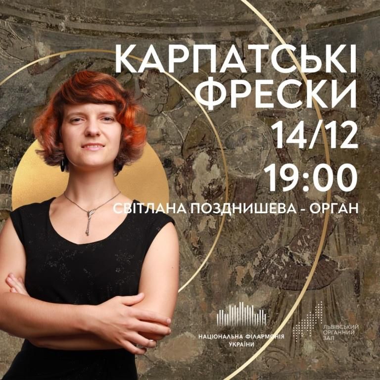 14 грудня «Карпатські фрески» – особливий концерт органної музики українських композиторів, записів якої ви майже ніде не знайдете.Твори Золтана Алмаші, Лесі Дичко, Володимира Губи, Олександра Щетинського, Георгія Куркова прозвучать у виконанні запрошеної артистки, солістки Львівського органного залу Світлани Позднишевої. Українські композитори усе більше звертаються до найбільшого і найвеличнішого з інструментів – органа. Багато органістів створюють органні перекладення симфонічних та інструментальних творів, чим підкреслюють, що орган – інструмент сучасний та дійсно універсальний, йому підвладні будь-які стилі та жанри. Тож, у концерті можна буде почути наживо, як поєдналися фольклорні мотиви, самобутність та віртуозність, піднесена духовність та актуальність в органних перекладеннях і оригінальних творах. Зокрема, прозвучить «Колискову і фуга» сучасного харківського композитора Олександра Щетинського, написана у 2023 році на замовлення Львівського органного залу, з нагоди 90-річчя органа.