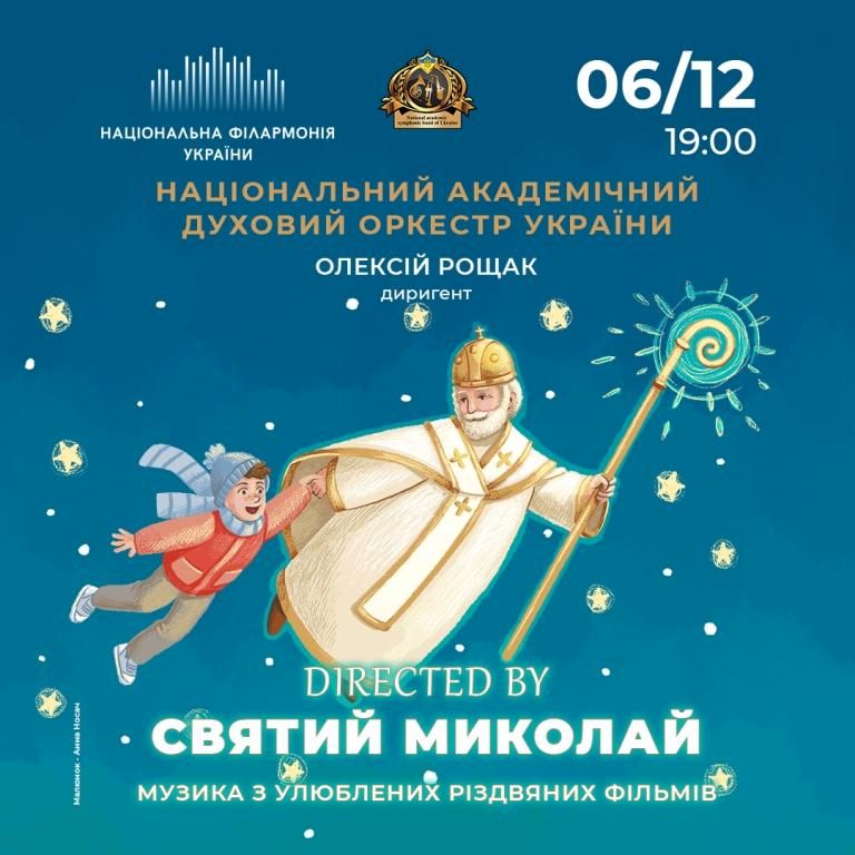 Також 6 грудня, але ввечері всією родиною й з більш дорослими дітьми можна піти на концерт – «Directed by Святий Миколай» Національного духового оркестру під орудою Олексія Рощака. Звучатиме святкова музика різних часів і народів, зокрема, британська, американська та українська: найпопулярніші саундтреки зі знаменитих мультфільмів «Північний експрес», «Крижане серце», «Ґрінч, викрадач Різдва», «Різдвяна історія», «Секретна служба Санта Клауса», з кінофільму «Сам удома» й попурі з безлічі улюблених різдвяних пісень.