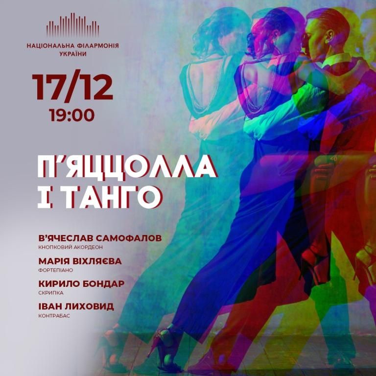17 грудня програму П’яццолла і Танго представлять віртуозні музиканти: В’ячеслав Самофалов | кнопковий акордеон, Марія Віхляєва | фортепіано, Кирило Бондар | скрипка та Іван Лиховид | контрабас. Експресивні сплески акордеону і ніжні відзвуки скрипки під темпераментний акомпанемент фортепіано і контрабаса – це як освідчення в коханні під палючим субтропічним сонцем. Усі танго звучатимуть у майстерному аранжуванні В’ячеслава Самофалова.