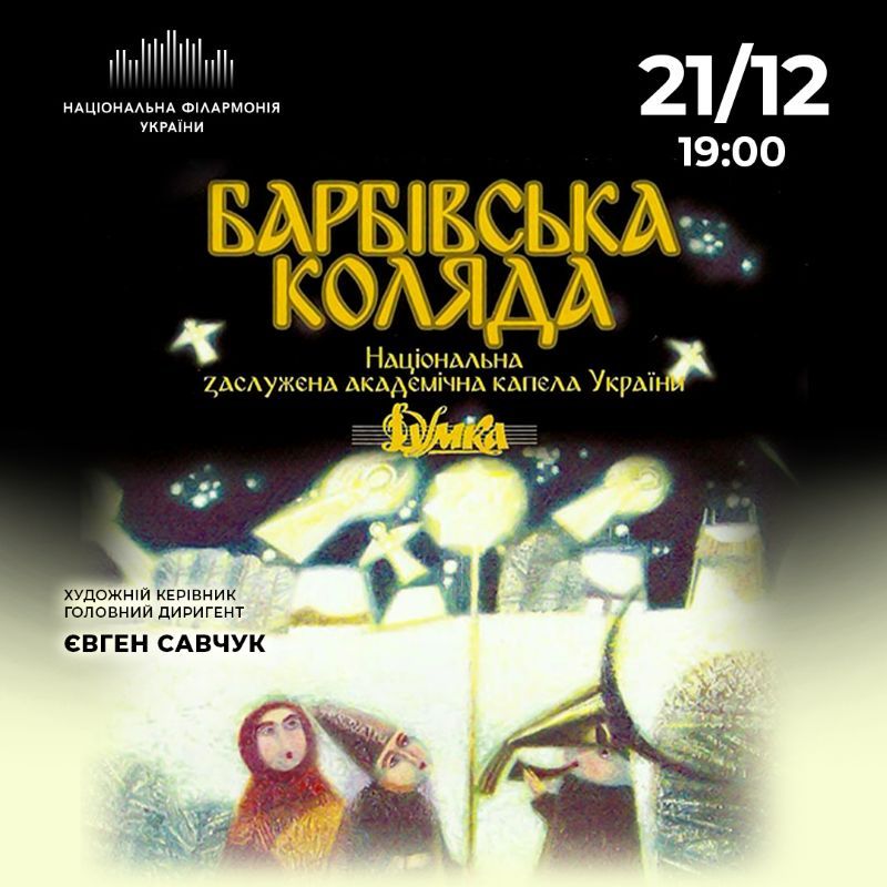 21 грудня у філармонії прозвучить грандіозний твір сучасної композиторки Ганни Гаврилець – «Барбівська Коляда» Прем’єра цієї ораторії відбулася 2012 року у Колонній залі Національної філармонії й у виконанні легендарної Капели ДУМКА і мала грандіозний успіх: її фрагменти включили до свого репертуару різні колективи. Але повністю підняти цей твір до снаги лише злагодженій громаді виконавців. Тож, цього вечора ДУМКА знов розгорне перед слухачами низку різдвяно-новорічних обрядів, серед яких 16 автентичних пісень із села Барбівці (нині воно має назву Брусниця) на Буковині.