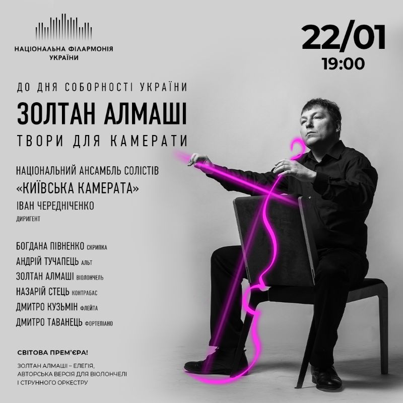 Прикметно, що День Соборності України, 22 січня, – ансамбль «Київська камерата» пропонує відзначити особливою програмою з творів сучасного композитора і віолончеліста Золтана Алмаші.