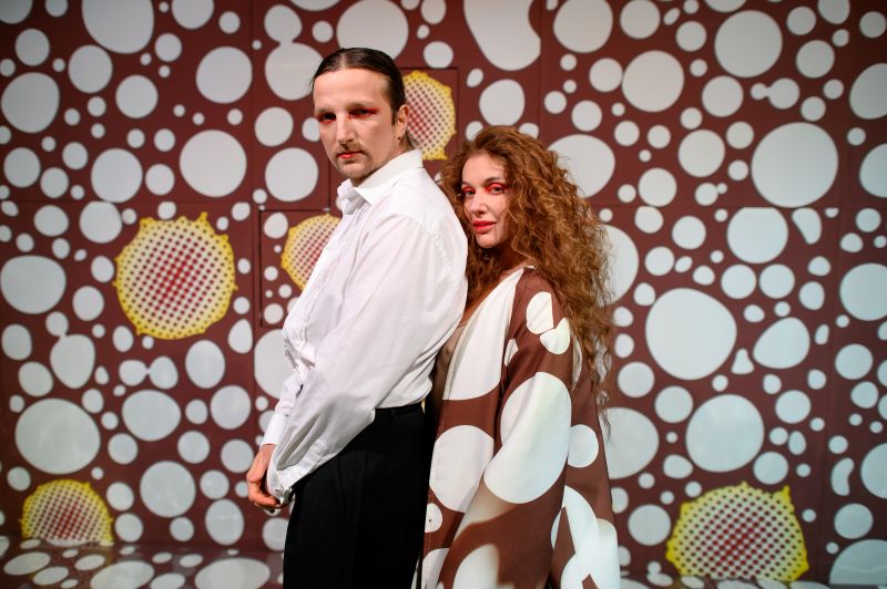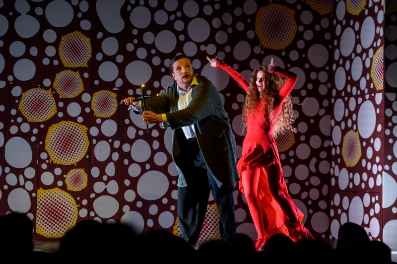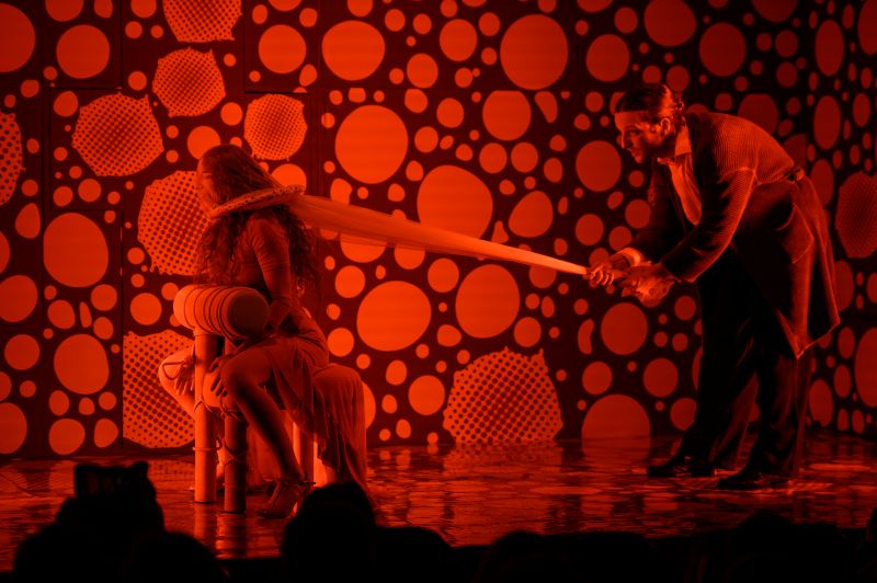 Сцена задекорована у червоний у білих цяточках колір (так у новелі Франко описував сукню Мані, в якій втекла від Хоми й зберегла вподовж трьох років поки блукала світами, пройшовши через страждання і виборюючи своє право стати сильною та вільною). Червоний колір несе й великий психологічний зміст, бо то колір пристрасті, кохання, крові, бажання, поневіряння, надії…
