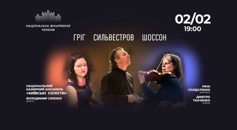 Центральна композиція вечора – Концерт для фортепіано, скрипки і струнного квартету Ернеста Шоссона. Солістами стануть Дмитро Ткаченко (скрипка) та Інна Солдатенко (фортепіано).