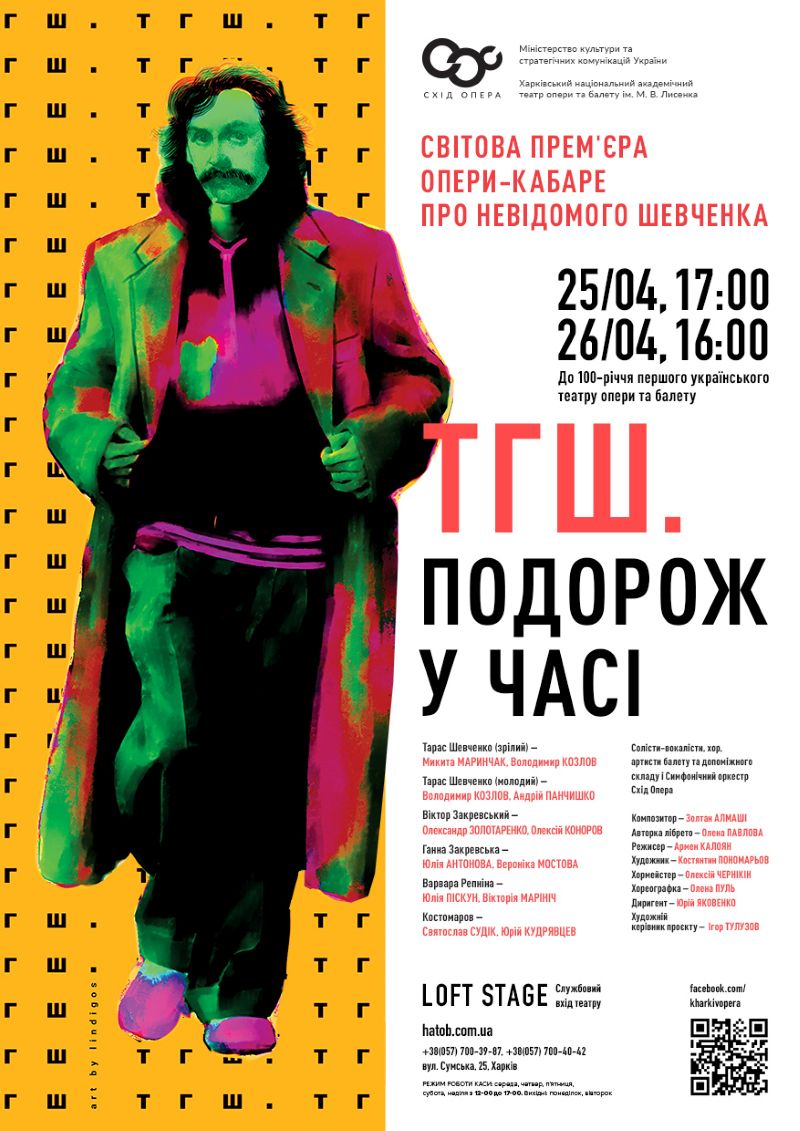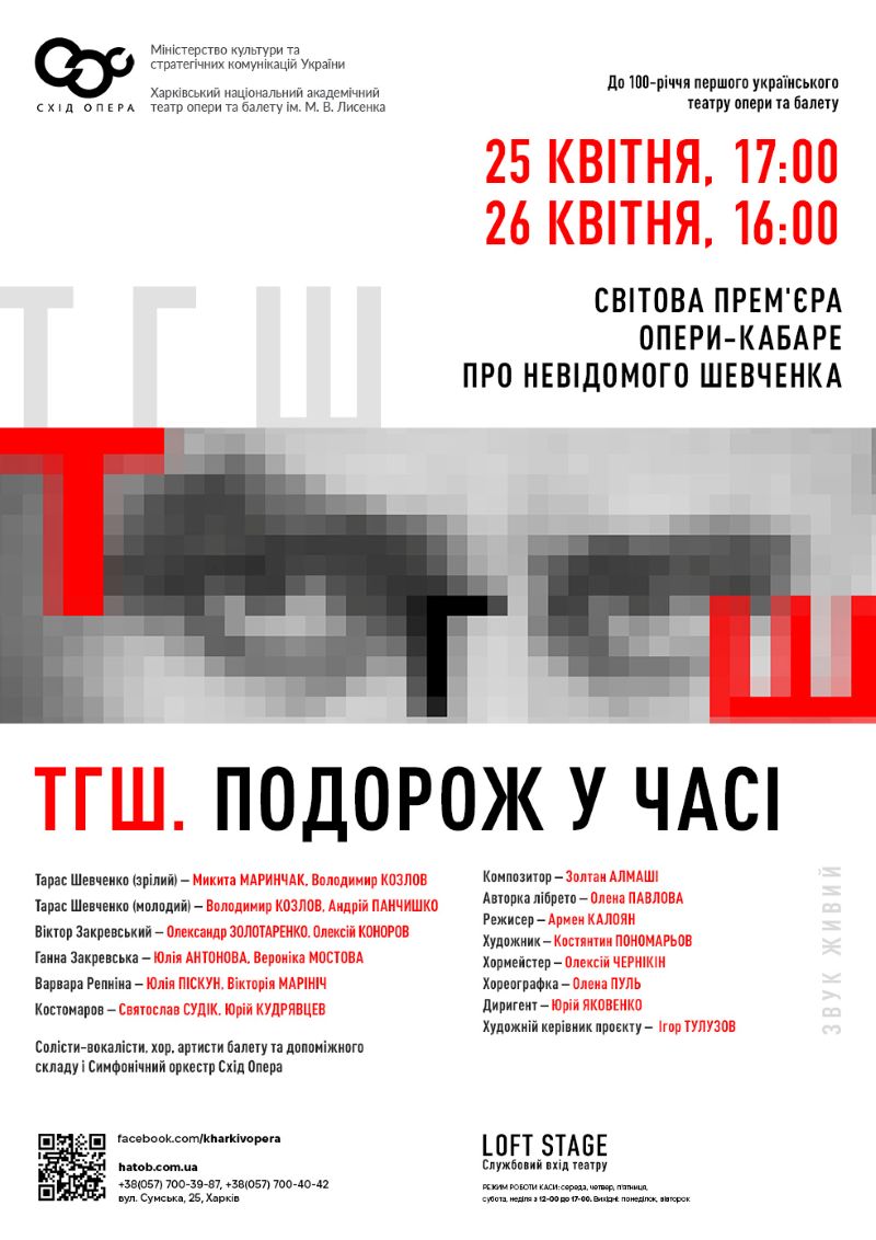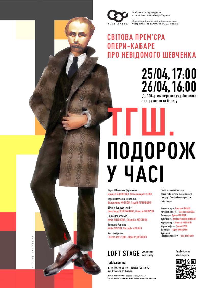У Харківському національному академічному театрі опери та балету імені М.В. Лисенка відбудеться прем'єра новаторської опери-кабаре «ТГШ. Подорож у часі», присвяченої 211-й річниці від дня народження Тараса Григоровича Шевченка.
