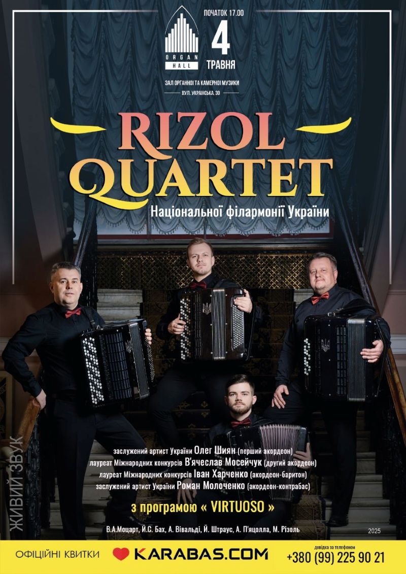 «RIZOL QUARTET» Національної філармонії України - унікальний музичний колектив, який упродовж 85-ти років гідно береже і примножує славні традиції свого засновника, Великого музиканта, патріарха баянно-акордеонної школи в Україні, народного артиста України, професора МИКОЛИ РІЗОЛЯ.