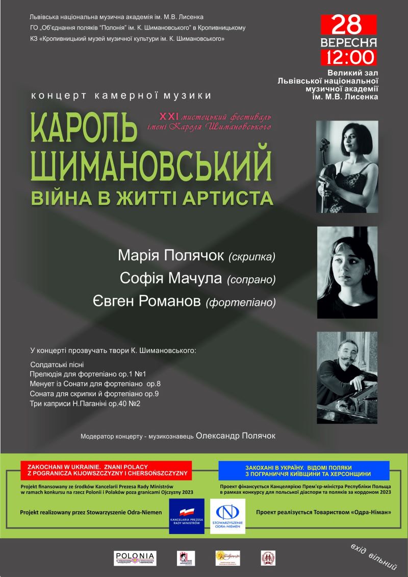 Фестиваль "Осінь з музикою Кароля Шимановського" – це свято камерної музики і автентичного фольклору, яке єднає міста і села Центральної України, де народився, бував, жив і творив класик польської музики ХХ століття.