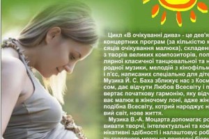 Цикл “Наближення дива” - це дев'ять концертних програм (за кількістю місяців очікування малюка), складених з творів великих композиторів, популярної класичної танцювальної та народної музики, мелодій з кінофільмів і п'єс, написаних спеціально для дітей.