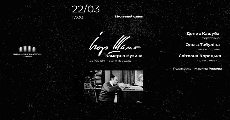 22 березня до 100-річчя від дня народження Ігоря Шамо звучатиме камерна музика композитора. Її виконають солісти філармонії Ольга Табуліна (мецо-сопрано) і піаніст Денис Кашуба.